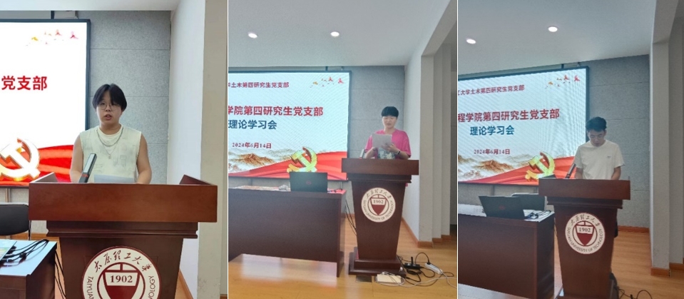 2024年6月14日,土木第四研究生党支部在学院五层会议室召开党纪学习教育专题学习会,深入学习贯彻习近平总书记关于党纪学习教育的重要讲话精神和重要指示精神,组织学习新修订的《中国共产党纪律处分条例》。会议由支部副书记闫鑫伟主持,支部书记邱斌、组织委员兰曈、宣传委员张英英及土木第四研究生党支部全体党员参加。